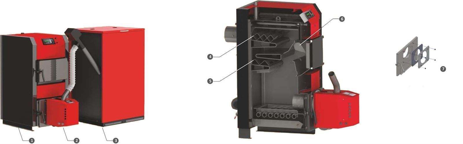 3. Caldera de combustibles Identificación del 505PEP está adaptada para madera pellets con quemador de pellets Pell y elementos adicionales como SORNE paso de humo de tres vías, puerta protectora superior.